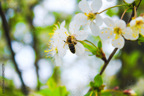 The bee collects the nectar on the flower of the spring tree. White flowers