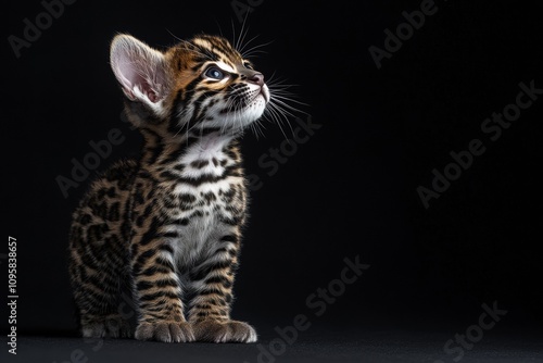 the beside view baby Ocelot standing, left side view, low angle, white copy space on right, Isolated on black Background