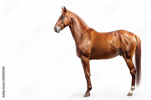 the beside view Thoroughbred Horse standing, left side view, white copy space on right isolated on white background
