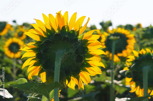 sunflower, blooming, flower, flower petals, sun, harmonious, yellow, orange, green, seed, beautiful, bright, colourful, sunlight, gold, field, crop, summer, morning, agriculture, farming, nature, landscape, sky, background, bulgaria
