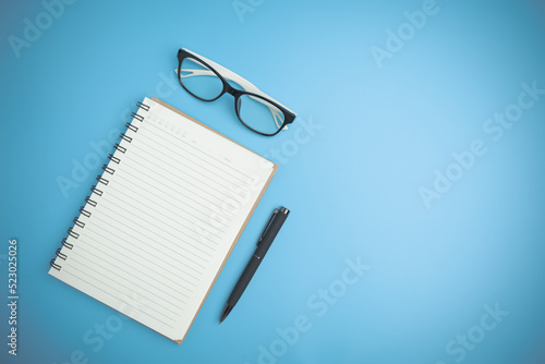 The blue office desk with a notebook, a pen, and glasses flat lay. Office table desk of the business flat lay, background with copy space. Top view workspace of table office.