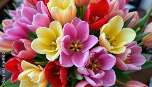 bouquet, vibrant, mix, fresh, pink, yellow, red, tulip, flower, bloom, delicate, flower petals, shades, stunning, arrangement, lively, assortment, new, rose, bright, colourful, high-coloured, blend, various, ai, generative