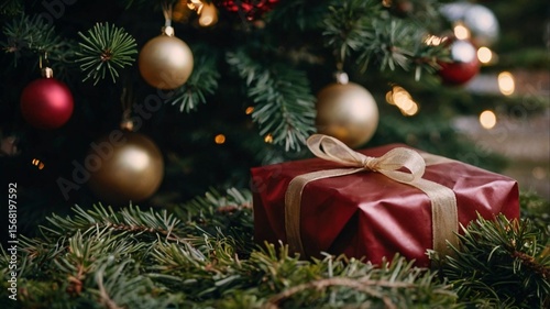 christmas, holiday, seasonal, gift, celebration, tree, decoration, present, winter, festive, box, ribbon, surprise, paper, year, new, tradition, christmas, red, bow, green, background, design, party, december, object, gold, happy, shiny, greeting, nobody, white, home, colours, package, wrapping, pine, eve, ornament, beautiful, wooden, room, new year, merry, fir, evening, stack, vintage