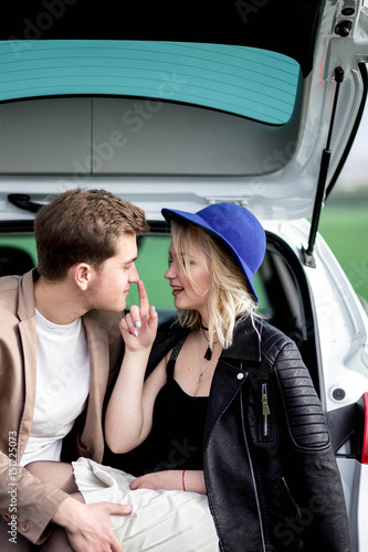 car, woman, couple, people, young, boy, family, auto, automobile, happy, girl, to sit, trunk, laughing