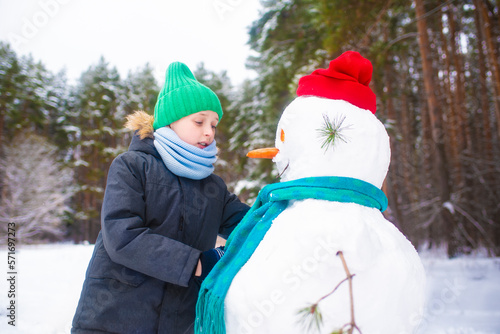 the boy made a snowman, a happy child plays in a snowy winter forest, straightens a scarf and a hat for a snowman