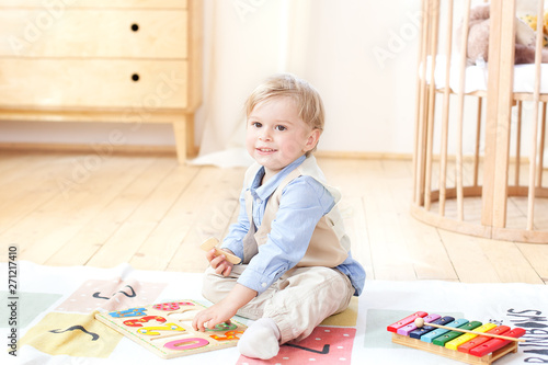 The boy plays with wooden toys and numbers. Educational wooden toys for the child. Portrait of a boy sitting on the floor in the children's room in the Scandinavian style. Eco toys, room decor