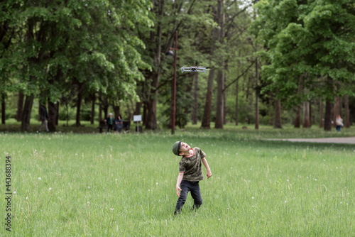 The boy runs on the green grass of the park and a drone flies over him. Boy playing with drone