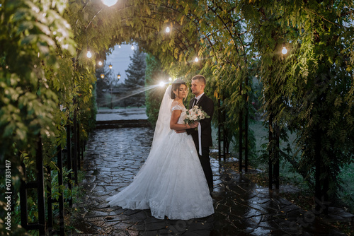 The bride and groom in the evening park with a bouquet of flowers in the middle of evening lights, greenery in nature. Romantic couple of newlyweds outdoors. Wedding ceremony in the botanical garden.