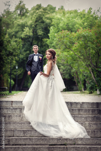 dress, couple, stair, happy, white, groom, step, adult, love, bride, woman, happiness, marriage, wedding, man, hand, family, caucasian, husband, kiss, tree, hold, spring, beautiful, gentle, day, emotion, veil, lace, baroque, recreation, background, suit, male, behind, concept, air, 2, summer, romantic, hugs, nature, stylish, hill, travel, married, posing, fashion