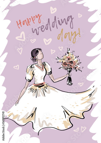 The bride with flowers. Watercolor Greeting card with a wedding day or a wedding anniversary. Wedding illustration with text happy wedding day
