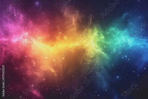 The bright night sky is a rainbow of colors blending perfectly. Stars twinkle in different shades.