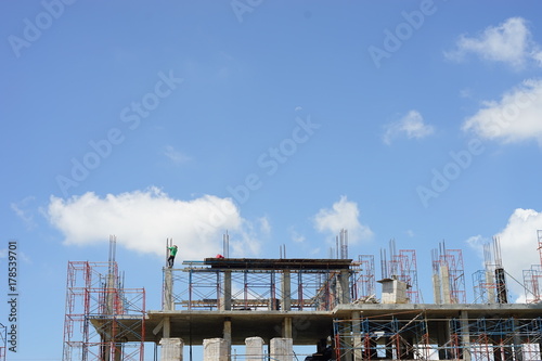 blue, construction, building, industry, site, engineering, equipment, future, home, high, sky, work, structure, architecture, background, industrial, modern, incomplete, housing, design, urban, growth, house, city, workplace, siam, development, men at work, metal, concrete, place, block, installing, progress, perspective, outdoors, material, danger
