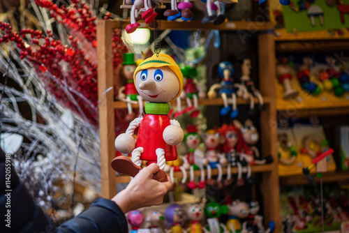 The buyer chooses environmentally friendly plastic-free toys for babies. Wooden toy for a child. Colorful. Crafts. Handmade.