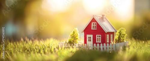 house, miniature, red, model, sunlight, nature, grass, garden, fence, greenery, landscape, calmness, home, childhood, dream, creative, decoration, soft, closeup, architecture, design, environment, warm, cosy, season, peaceful, rustic, little, small, bright, cute, detail, concept, toy, spring, inspiration, idylli, picturesque, play, joy, photo