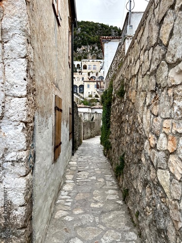 The charming vernacular architecture of Dhermi village on the Albanian Riviera, with traditional stone houses blending into the natural landscape, reflecting the region's cultural heritage.