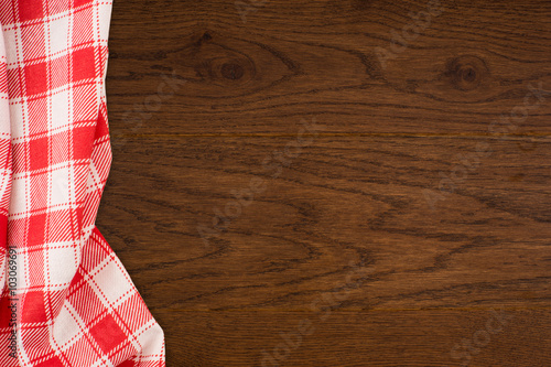 the checkered tablecloth on wooden table