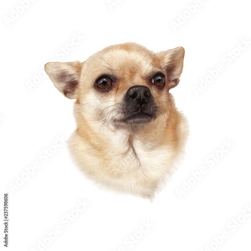 The Chihuahua dog isolated on white background. Drawing of Head of a toy terrier. Animal art collection: Dogs. Cute realistic puppy Portrait. Hand Painted Illustration of Pet. Design template.