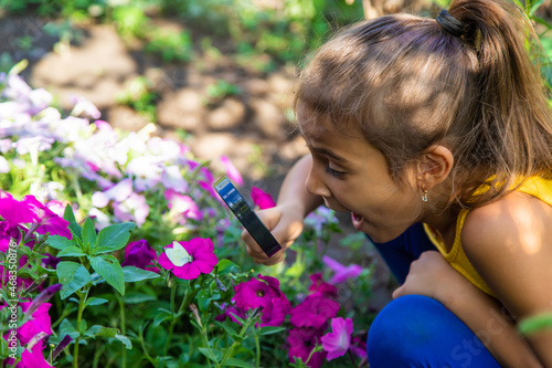 The child examines the plants with a magnifying glass. Selective focus.