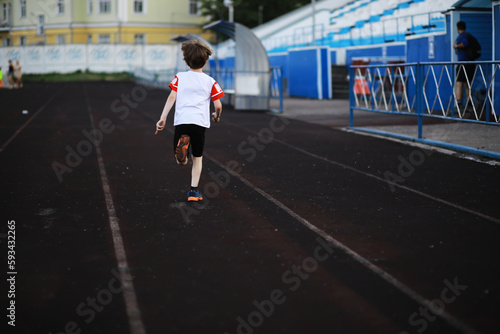 The child goes in for sports at the stadium. The boy is training before playing football.