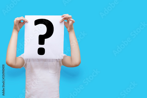The child holds a piece of paper with a question mark on a blue background and covers his face. The concept of curiosity or indecision. Question mark on white paper with free space for text