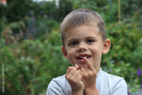 The child lost a tooth. Selective focus.Concept baby tooth