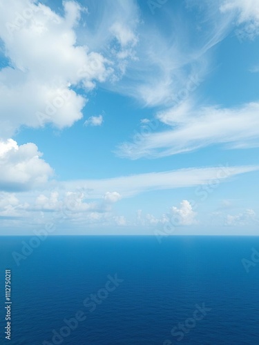 The cloudy blue sky gradually merges with the infinite blue line of the horizon above a tranquil ocean, sea, serene