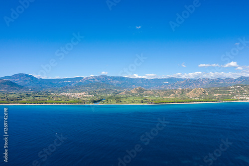 The coast seen from the sea in Lotzorai in Europe, Italy, Sardinia, Lotzorai, in summer, on a sunny day.