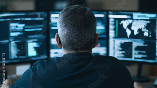 The Code Whisperer: A lone programmer intently focuses on multiple monitors filled with lines of code, immersed in the world of software development.