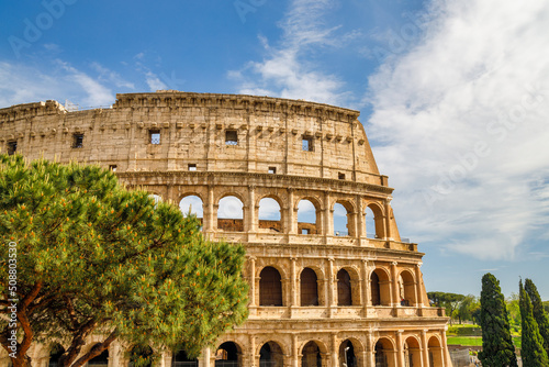 The Colosseum amphitheatre in the centre of the city of Rome, Italy, Europe.