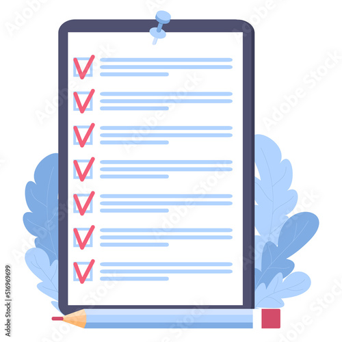 vector, business, paper, checklist, plan, approved, questionnaire, choose, yes, tick, list, note, reminder, schedule, planner, organiser, pin, to do, mark, task, board, form, clipboard, check, datum, crayons, concept, flat, report, document, page, design, illustration