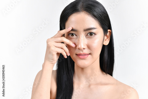 The concept of healthy beauty woman. Beautiful women keep healthy. Beautiful women take care of skin health. Beautiful women are thinking about beauty. Beautiful Asian girl is pointing fingers.