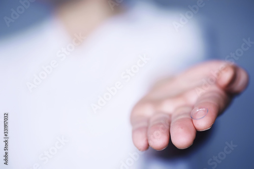 The concept of poor vision. Hold a contact lens and glasses in hand. A poster for advertising glasses and lenses.