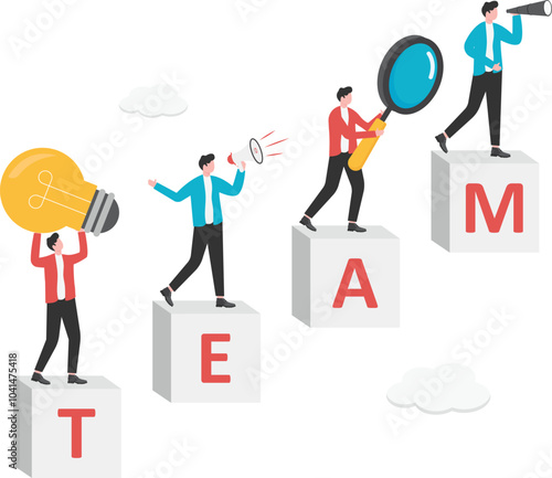 The concept of teamwork, team group members stacking human pyramid to raise the steps,
