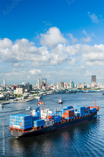 The container ship sailing into the port of Kaohsiung, Taiwan.