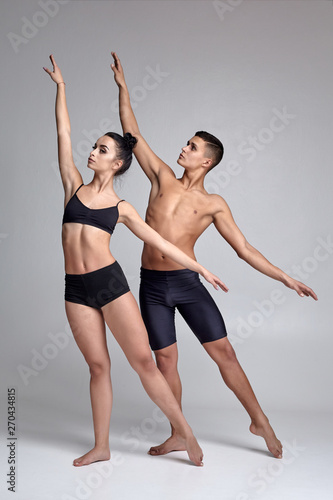 The couple of a young modern ballet dancers in black suits are posing over a gray studio background.