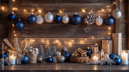 christmas, decoration, ornament, light, candle, holiday, festive, wood, background, blue, silver, pine, gift, table, celebration, season, shiny, glimmer, cosy, atmosphere, snowy, sparkle, warmth, winter, arrangement, home, traditional, joy, cheerful, design, beauty