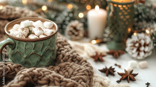 cosy, winter, light, spice, holiday, wood, festive, table, home, candle, pine cone, cheerful, decoration, green, evening, warm, rustic, drink, beverage, aroma, cocoa, brown, soft, comfort, mug, season, relax, tradition, knitted, atmosphere