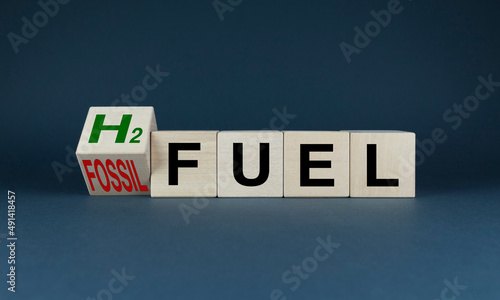 The cubes form the words Fossil fuel to H2 fuel. Clean and green energy concept