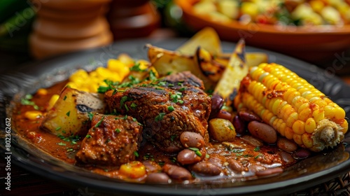 The cuisine of Bolivia. Paseno Plateau is a dish made from a piece of meat, corn cob, beans and potatoes.
