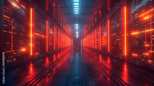 The dark futuristic sci-fi spaceship neon red lights illuminate the long metal corridor