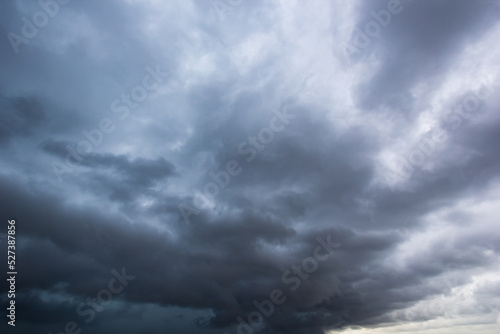 The dark sky with heavy clouds converging and a violent storm before the rain.Bad or moody weather sky and environment. carbon dioxide emissions, greenhouse effect, global warming, climate change.