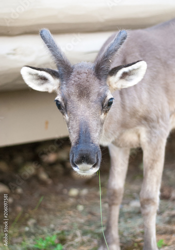 reindeer, cervid, racked, house, wooden, log, blockhouse, ground, greenery, grass, wood, outdoors, vertical, nature, artiodactyl, fawn, brown, animal, green, horn, spout, grey, board, finland, small, cute, scandinavia, north, graze, beautiful, sight, domestic, wild
