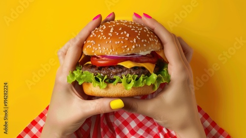 burger, hand, food, beef, closeup, picnic, colourful, fresh, grilled, yellow, sandwich, cheeseburger, healthy, casual attire, dinner, dining, delicious, lettuce, bright, meal, tomatoes, cheese, hand-held, hold, tomatoes, bun, lunch, tasty, sesame, fast, epicure, cookery, juicy, nail, appetising, eat, fingernail, patty, nail polish, finger food