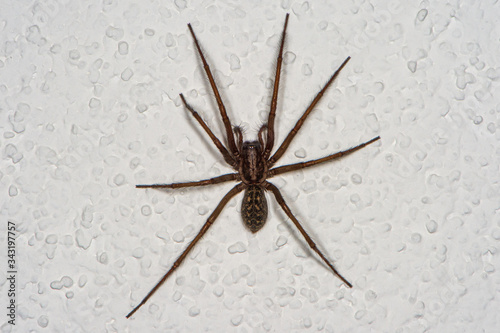 The detailed macro image of a big brown domestic house spider on the white wall