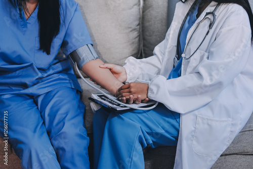The doctor woman hand use the pulse meter to measure the pressure of the patient, medical checkup concept.