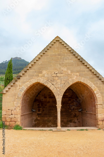 The double arched building of Fuenta de los Moros, the Gothic Fountain of the Moors, the ruins of Castillo de Monjardin in the background, at Villamayor de Monjardin Spain