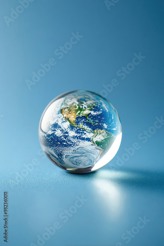 The Earth encapsulated in a crystalclear water droplet against a blue background