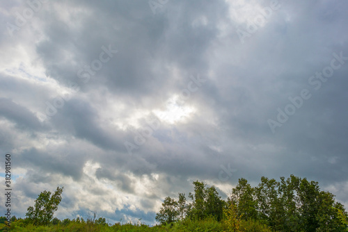 The edge of a lake in a green windy rainy wetland in spare sunlight under a grey white cloudy sky in autumn, Almere, Flevoland, The Netherlands, October 4, 2020