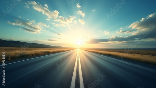 The endless road stretches towards a bright, golden sunset symbolizing hope