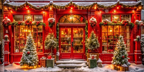 The entrance to the store, decorated for Christmas, is covered with snow. Christmas trees, garlands, balls and falling snow. The atmosphere of anticipation of the holiday and New Year's miracle.